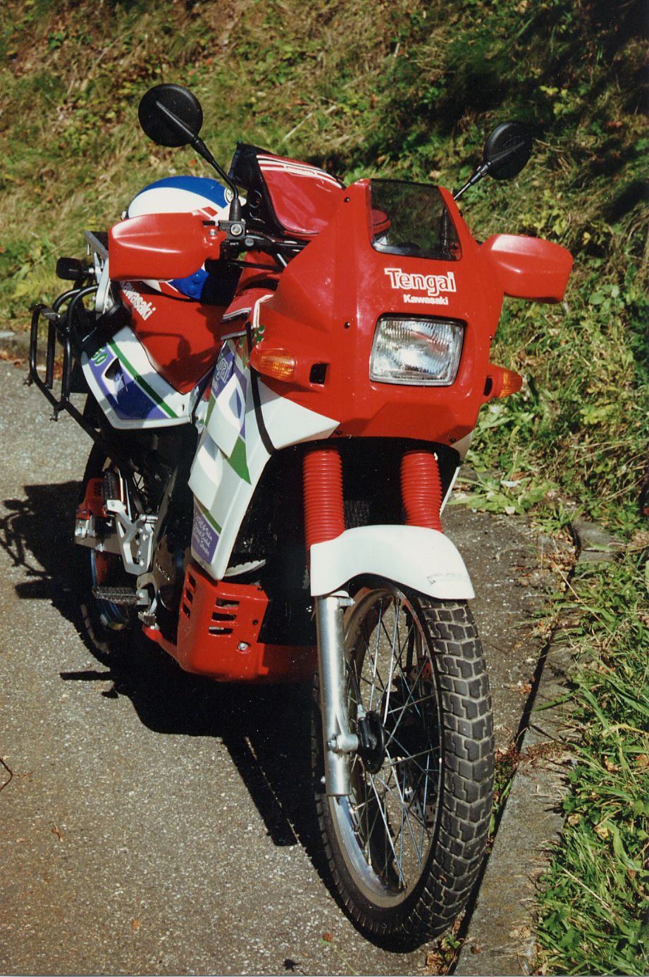 Wer seine Tengai das ganze Jahr über bewegt, wird bei Startschwierigkeiten schon häufiger den Kickstarter der KLR 600 oder des Nachfolge-modells KLX 650 herbeigesehnt haben: Der paßt ohne Probleme an die vorhandene Starterwelle. Die Tengai wurde von 1989 bis 1992 hierzulande angeboten. Dann wurde sie von der viel geländegängigeren, sportiveren KLX 650 abgelöst, die allerdings wegen diverser Motorschäden bald wieder vom Markt verschwand.